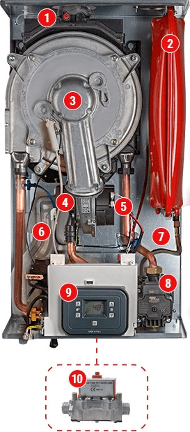 - Нова система згоряння із запатентованою технологією адаптації до газу (Advanced Adaptive Gas Combustion Control A²GC²). Електроніка безперервно аналізує згоряння (CO 2 ) через сигнал полум'я, впливаючи на газовий клапан і вентилятор, щоб забезпечити правильне згоряння за будь-яких умов використання. Електроніка дозволяє легко адаптувати котел до різних типів газу без необхідності використовувати комплекти механічного перетворення